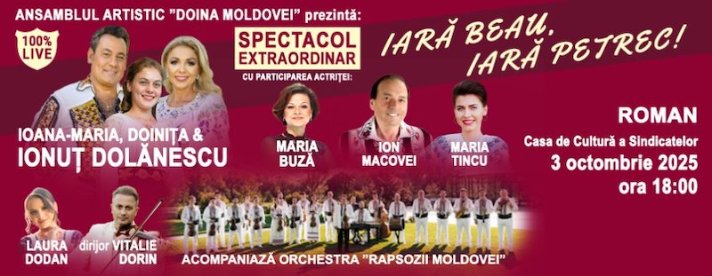 Pregătiți-vă pentru o seară memorabilă alături de unii dintre cei mai îndrăgiți artiști ai muzicii populare și ai scenei românești! Ansamblul Artistic „Doina Moldovei” vă invită la un spectacol grandios, plin de energie, tradiție și emoție – „IARĂ BEAU, IARĂ PETREC!” – un eveniment dedicat bucuriei de a trăi și de a sărbători românește.